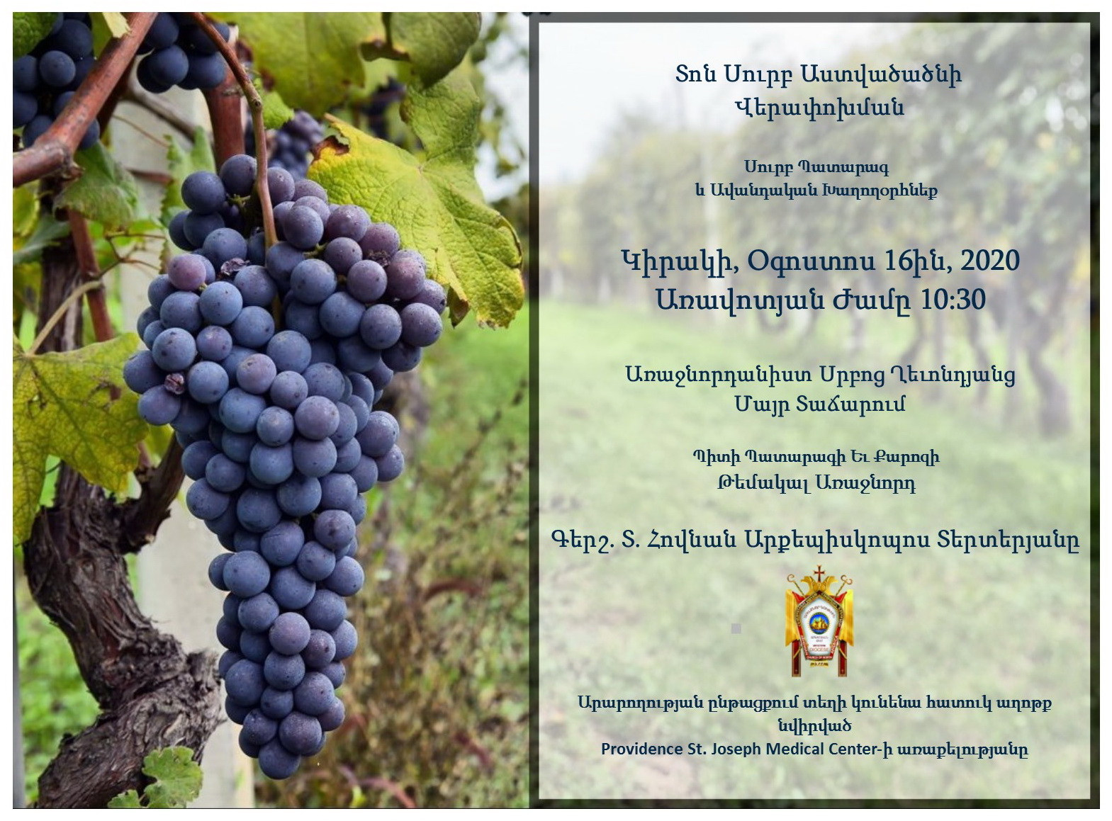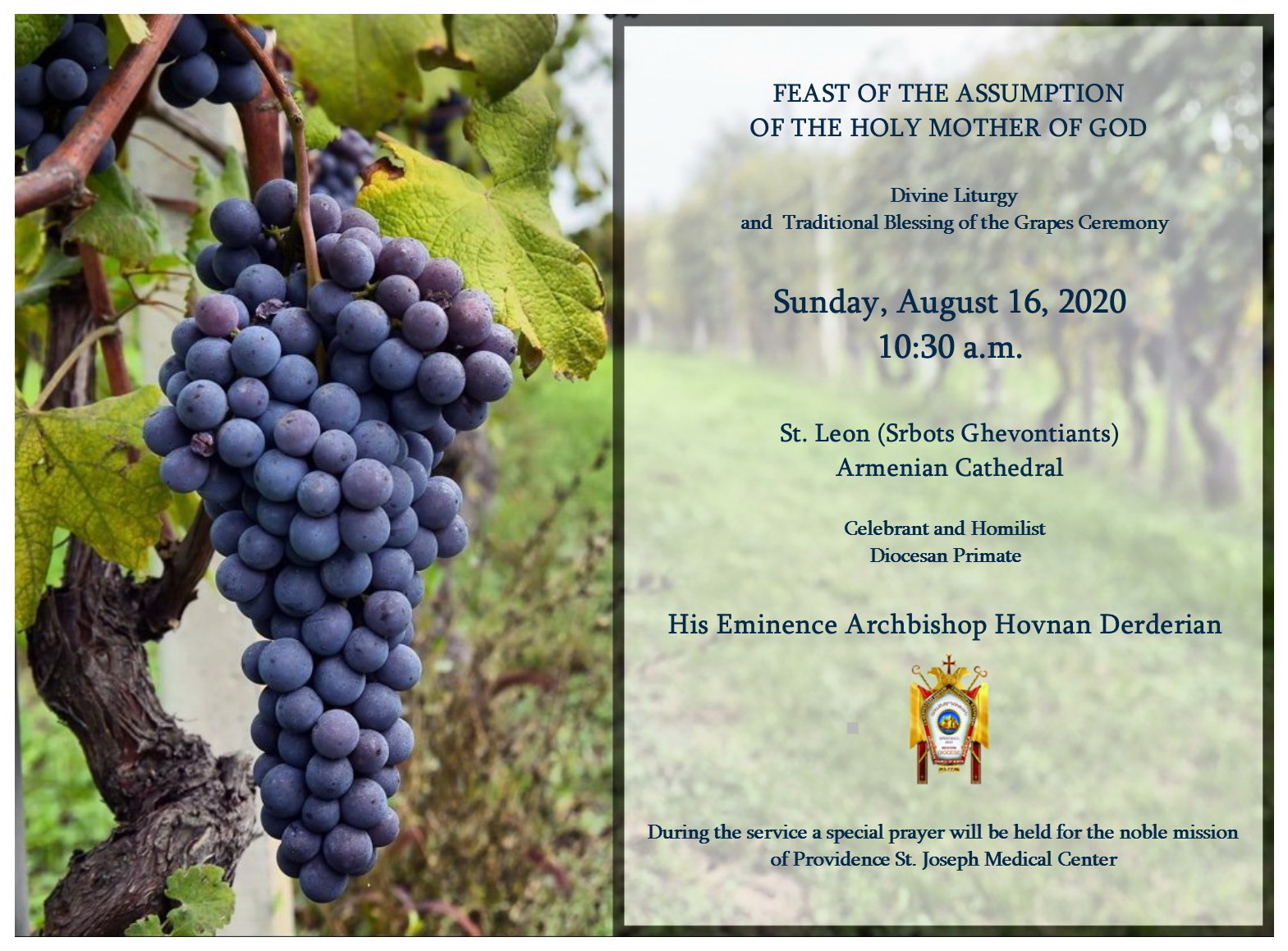 On Sunday, August 16, the Armenian Apostolic Church will observe the Feast of the Assumption of the Holy Mother of God. At St. Leon (Srbots Ghevontiants) Armenian Cathedral, the day's celebrant and homilist will be the Diocesan Primate His Eminence Archbishop Hovnan Derderian.
