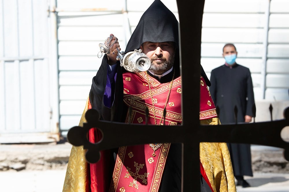 In front of the Mother Cathedral, according to tradition, under the chanting of psalms the Cross was washed with wine and water, and after prayers and scripture readings from the Bible, His Grace Bishop Hovnan and His Grace Bishop Mushegh Babayan, Director of the Operations Department of the Mother See of Holy Etchmiadzin, consecrated the Cross with Holy Muron. After the offering of incense under the hymn “Your Cross, Christ”, the clergy kissed the newly consecrated Cross.