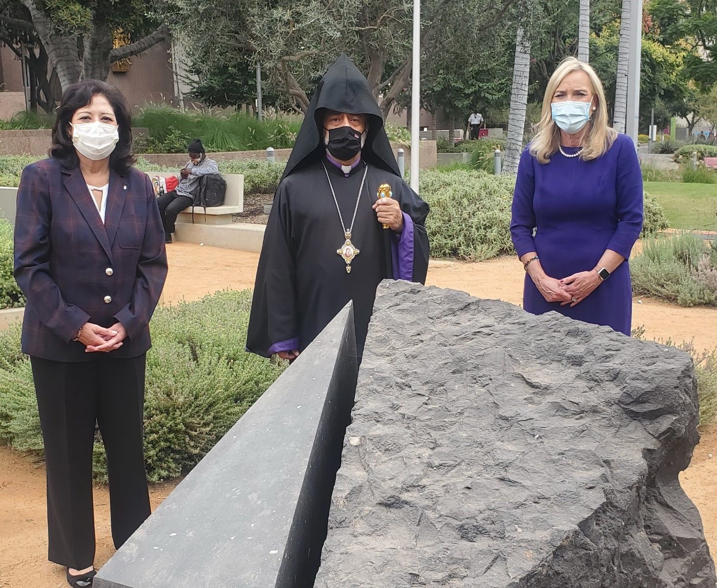 On October 23, Supervisors Kathryn Barger and Hilda Solis joined with representatives of the Armenian faith community at the Armenian Genocide Memorial in Grand Park to provide prayer and intentions for the current suffering of Armenians in Artsakh. The faith representatives included Archbishop Hovnan Derderian (Western Diocese), Bishop Torkom Donoyan (Western Prelacy), Father Armenag Bedrossian (Our Lady Queen of Martyrs Church), and Reverend Berdj Djambazian (Armenian Evangelical Union of North America).