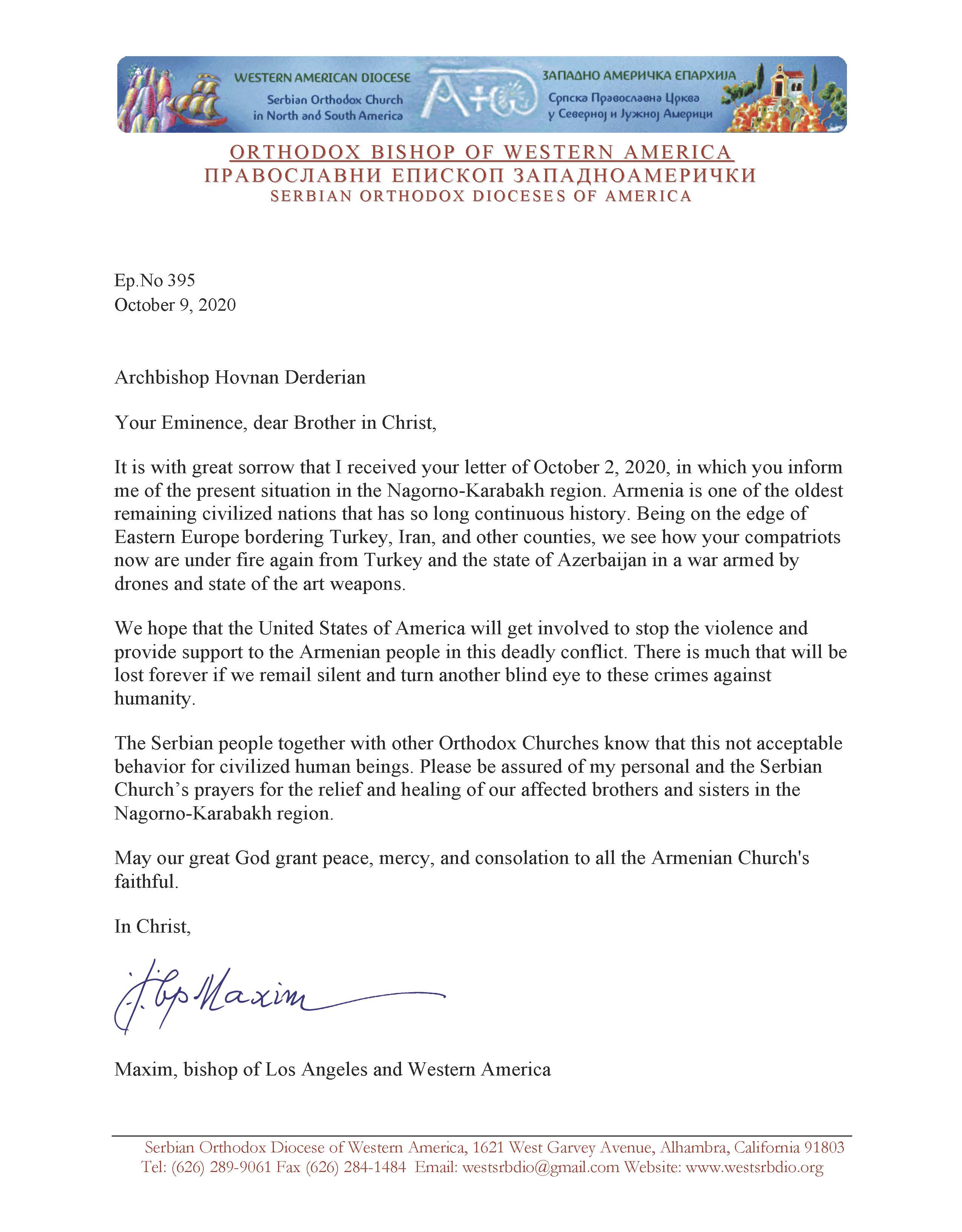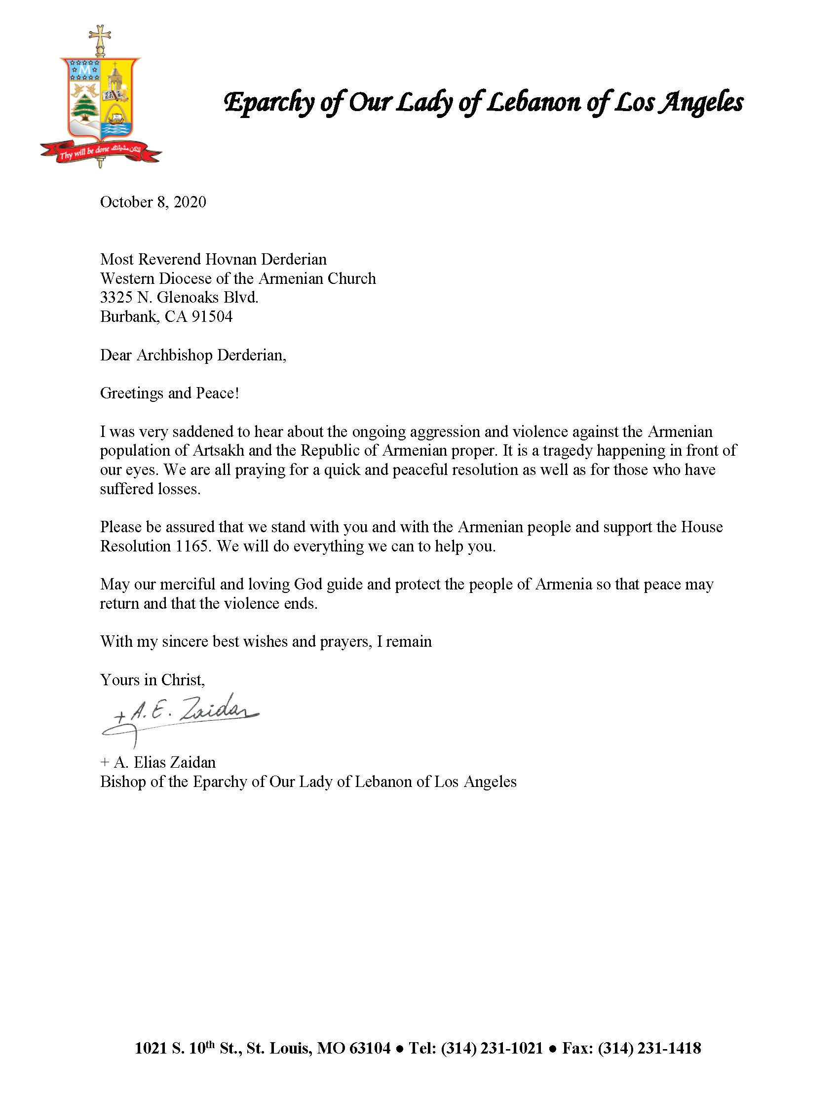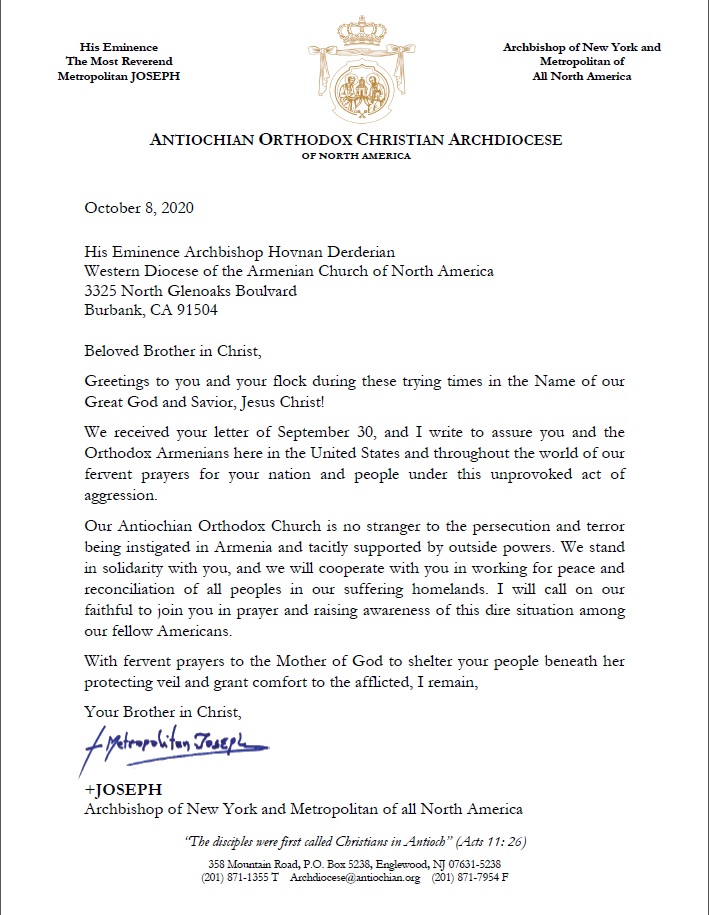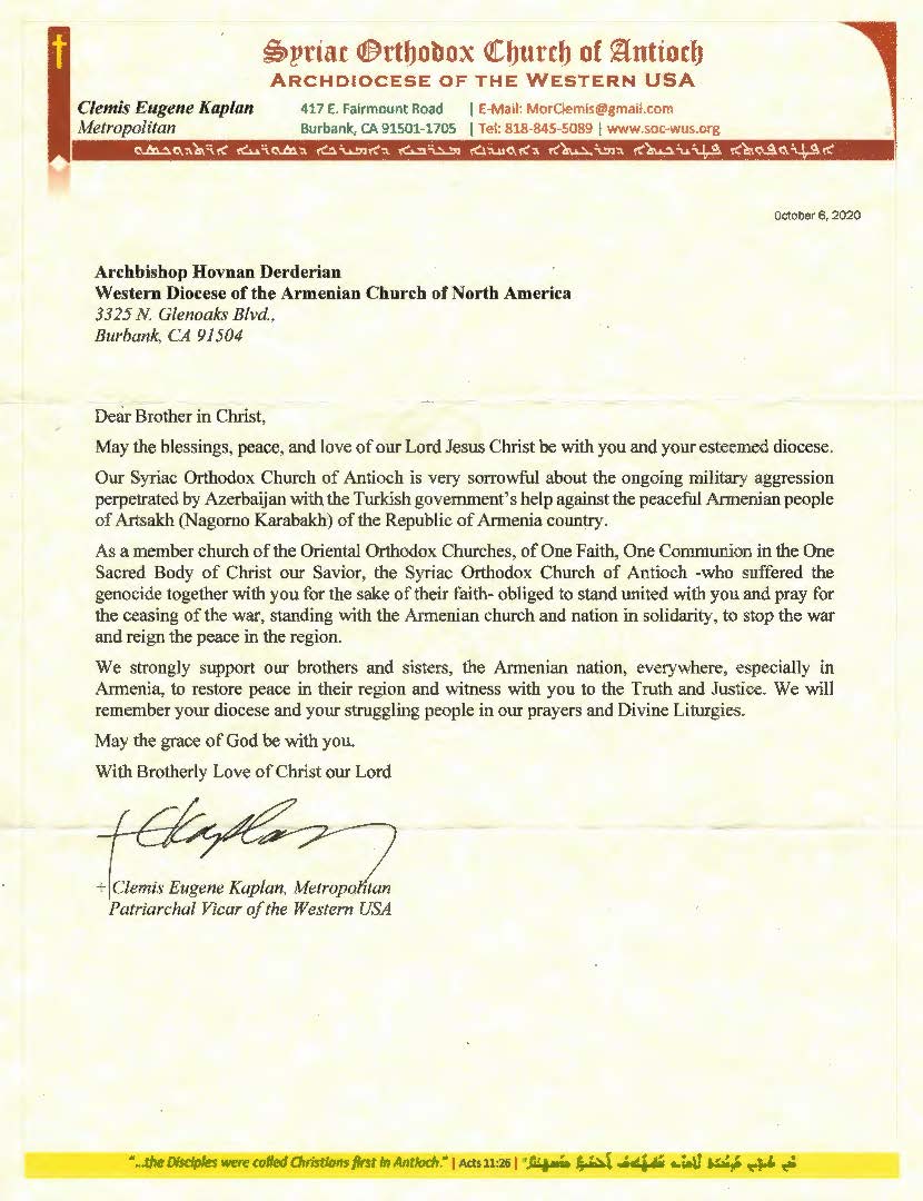 Church leaders Metropolitan Serapion of the Coptic Orthodox Diocese of Los Angeles and Metropolitan Gerasimos of the Greek Orthodox Metropolis of San Francisco have reached out to the Diocesan Primate informing Archbishop Derderian that prayers for Artsakh are being held within their respective communities.