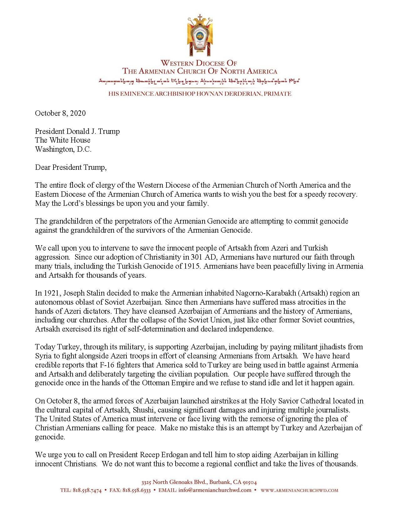 In a letter addressed to President Donald Trump dated October 8, the Primates and the reverend clergy of the Eastern and Western Dioceses of the Armenian Church of North America urged the President "to intervene and save the innocent people of Artsakh from Azeri and Turkish aggression."Â Â