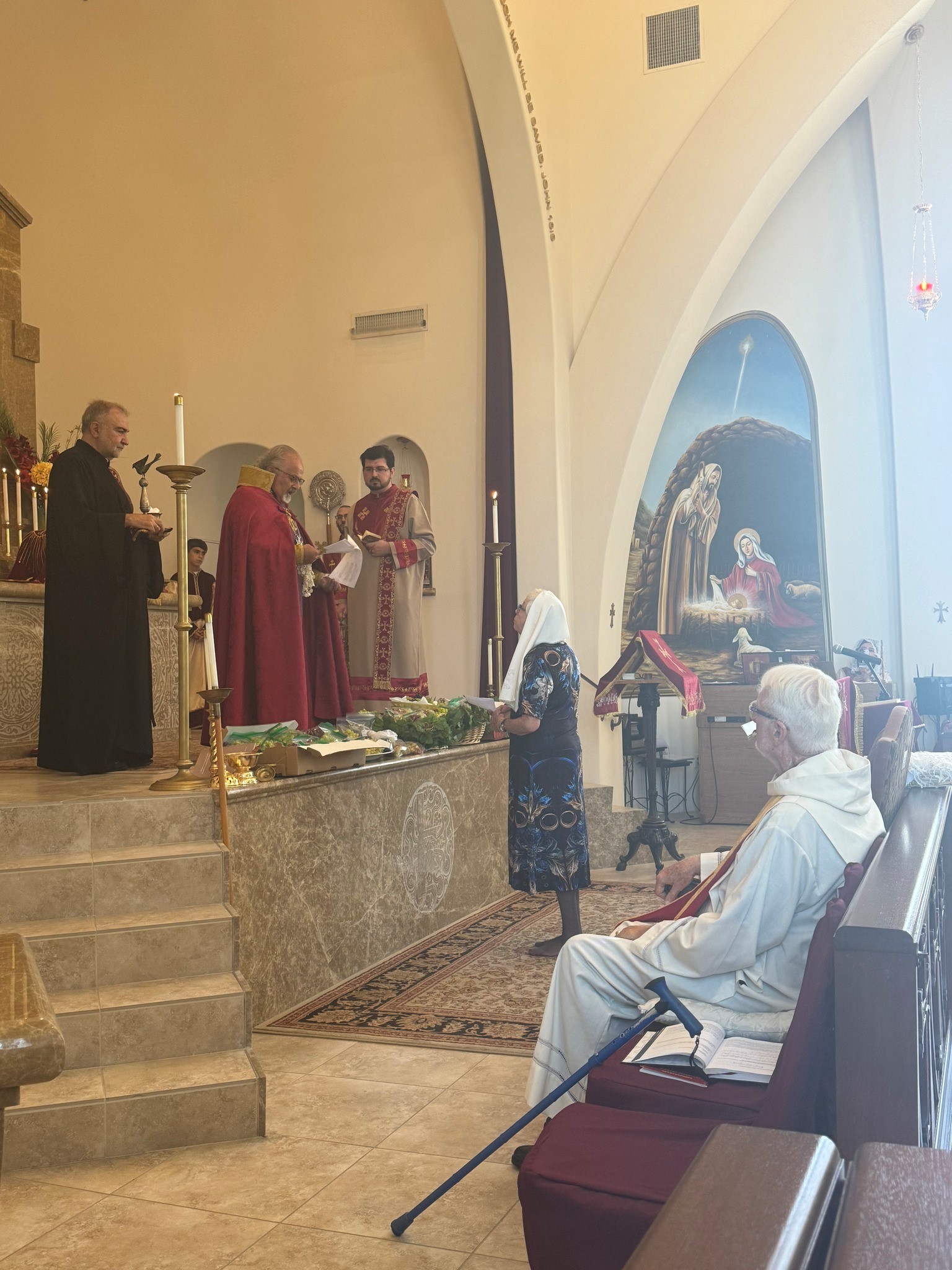 I was welcomed into the Armenian Apostolic Church of the Desert on 8/18/2024.  On that day you escorted me to the altar where Fr. Movsesian anointed me with Holy Myron. He touched my head, eyes, ears, heart, hands and feet.  9 years ago I lost the vision in my left eye and feeling in my left hand. Problems from being a life-long insulin dependent diabetic. I was told by retinal specialists that nothing would improve my vision. I've had 3 hand surgeries in the past 2 years and it has helped a little.  Since the anointing on August 18, the vision in my left eye is so much better. I am typing this and can read the words! My left hand is free from pain.  Thank you so much for supporting me in the journey. At 74 years old I feel like a new human being. Healthy, happy and I have a church home!Â