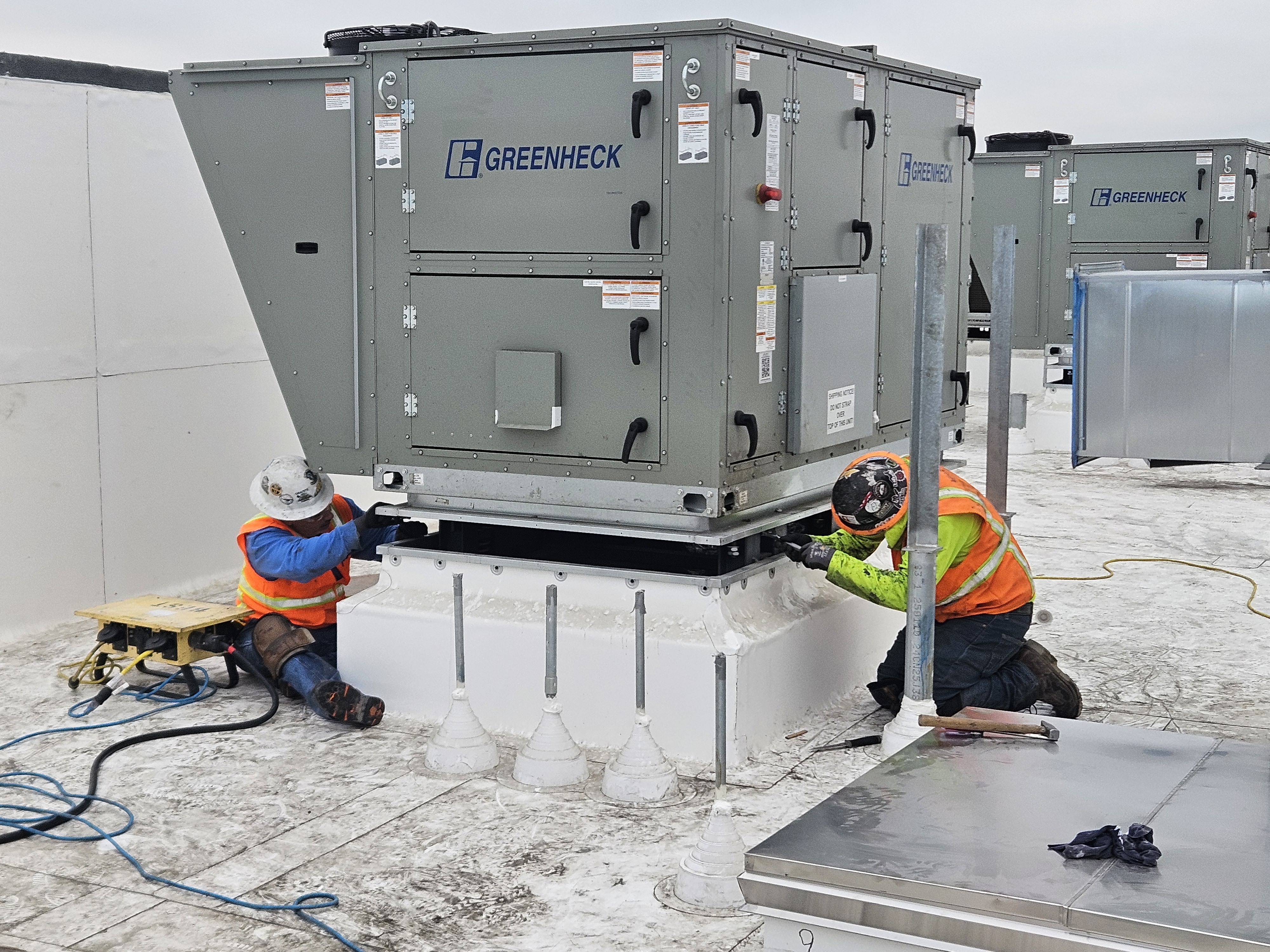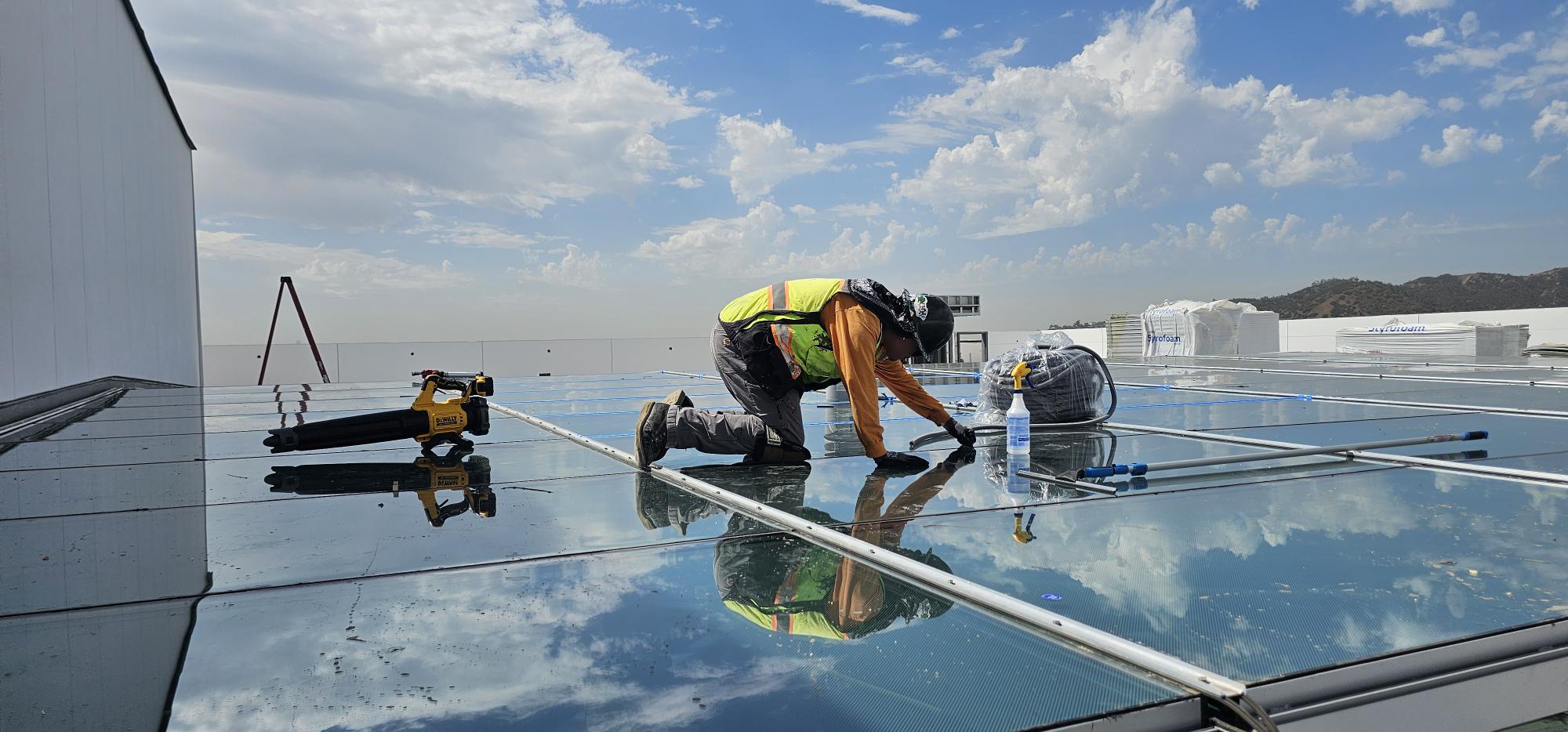Final checks are underway at the Armenian American Museum roof deck as the team reviews and confirms HVAC systems and skylight installations.