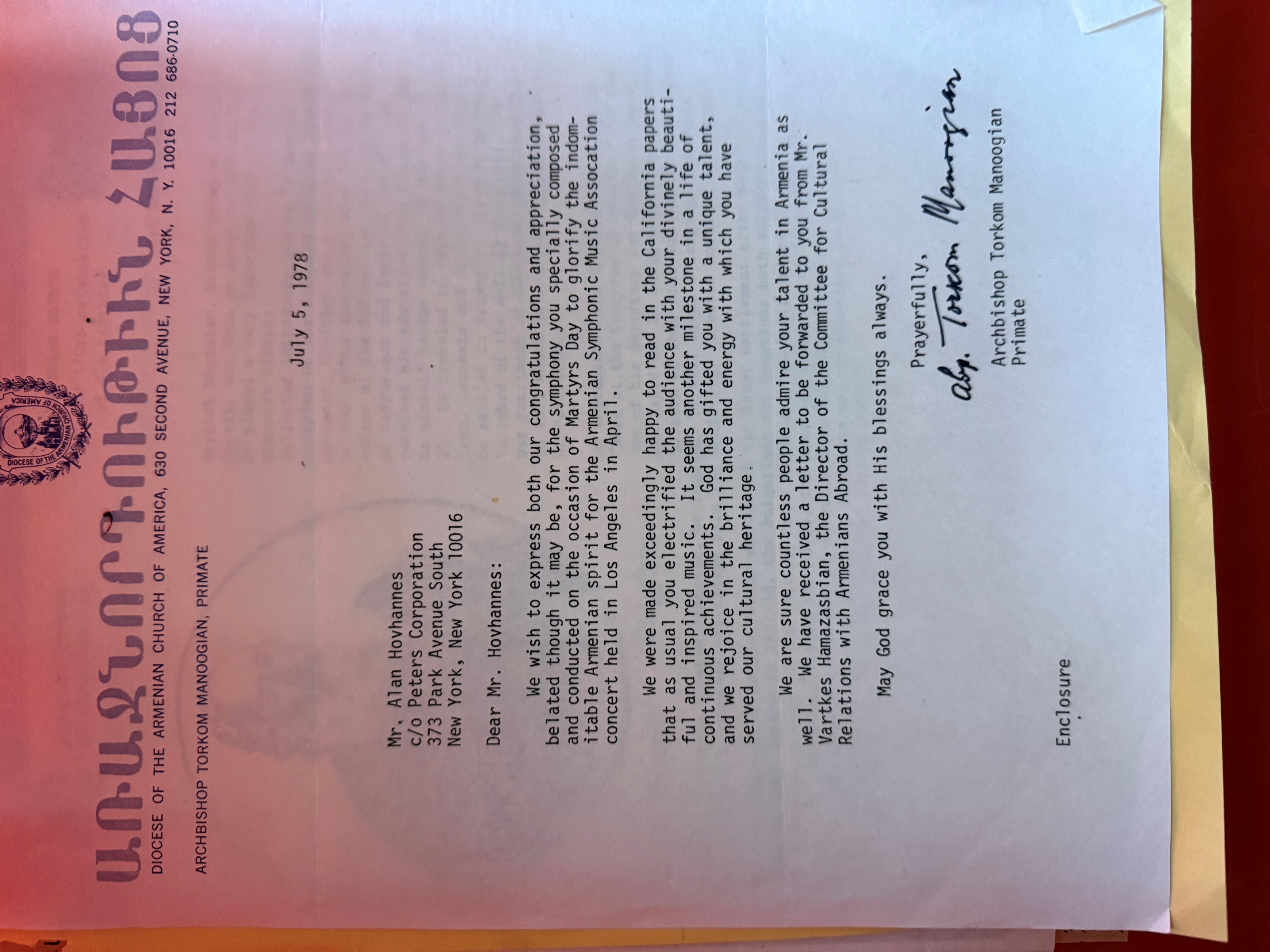 The composer’s stepson William, together with his wife Coleen, will continue to carry forward this legacy. Next month, they will travel to Arlington, Massachusetts, for the blessing of a book about Alan Hovhaness written by his mother, before bringing the same celebration to Los Angeles. Plans are also underway for a special commemoration in the Western Diocese, anticipated either later this year or early next year.