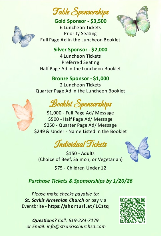Proceeds from the event will benefit the church’s ongoing operation to support the growing Armenian community of San Diego, including its growing youth program. Musical entertainment will be provided by Shant Tanielian.