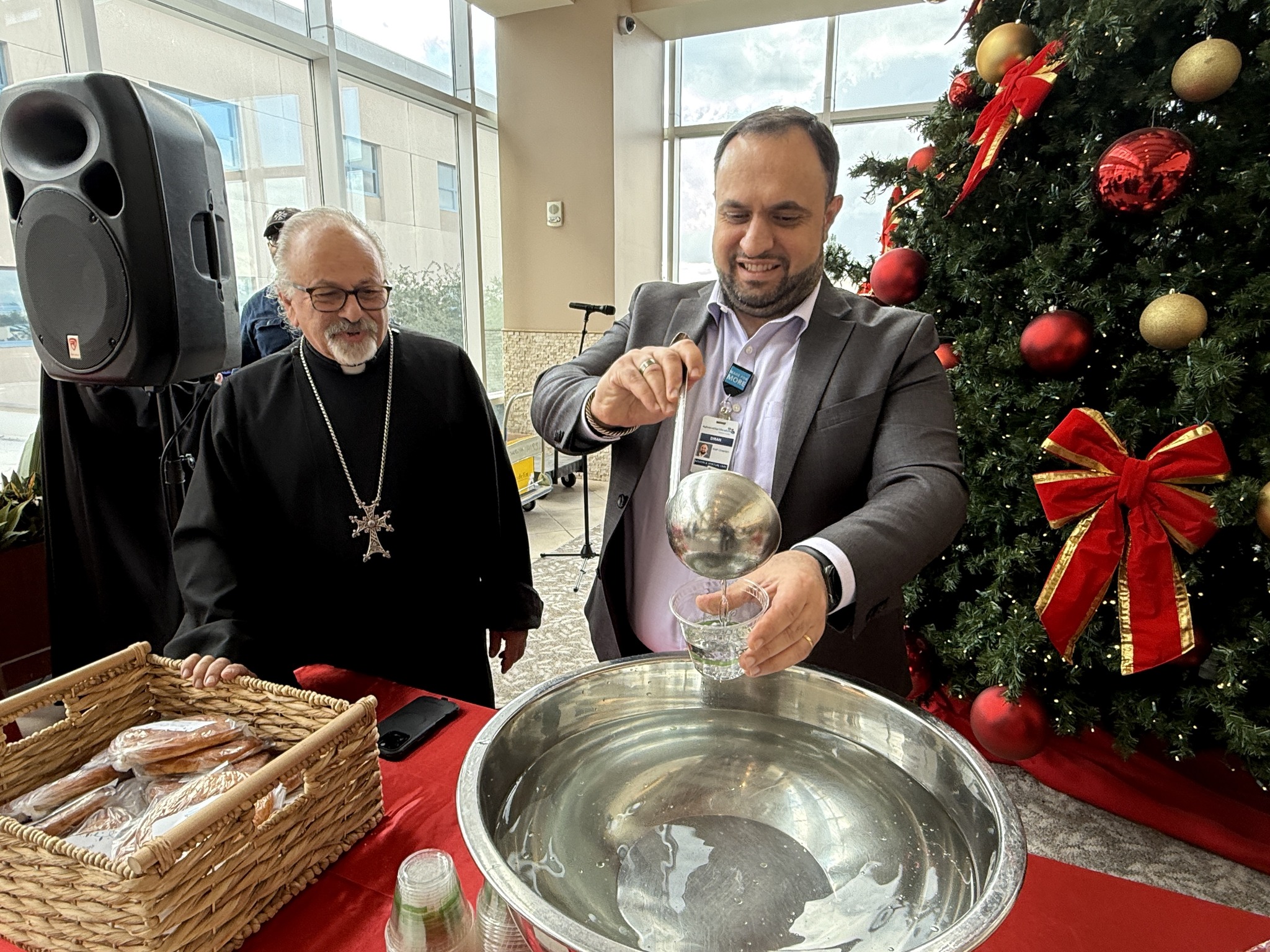 Accompanied by Diocesan clergy Rev. Fr. Vazken Movsesian, Rev. Fr. Yeremia Khachatryan, and Chaplain Diran Avagyan, Archbishop Derderian presided over the traditional Blessing of the Water Service, commemorating Christ’s Baptism in the River Jordan. The service, rich in symbolism, proclaimed the sanctification of creation and the renewing grace of God, invoking blessings upon all those receiving care and those dedicated to the ministry of healing within the hospital.