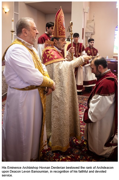 On the occasion of this pastoral visit, and at the request of the parish priest Archpriest Fr. Datev Harutyunyan, His Eminence recognized the many years of faithful and distinguished service rendered by Deacon Levon Barsoumian to St. Andrew Armenian Church. In appreciation of his dedication, His Eminence elevated him to the rank of Archdeacon. The parish family expresses its profound gratitude to our caring Primate and extend our heartfelt congratulations to Archdeacon Levon Barsoumian, praying that the Lord grant him continued strength and grace in his sacred ministry.