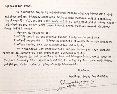 Ժողովը նկատի ունենալով Քալիֆոռնիայի հայոց ընդհանուր բաղձանքը եւ առանձին առաջնորդութեան համար հարկ եղած բարոյական եւ նիւթական զոհողութեանց յանձնառութիւնները՝ ՄԻԱՁԱՅՆՈՒԹԵԱՄԲ ՀԱՄԱՄԻՏ ԳՏՆՈՒԵՑԱՒ, ՈՐ ՇՈՒՐՋ ԵՐԵՔ ՀԱԶԱՐ ՄՂՈՆ ՀԵՌԱՒՈՐՈՒԹԵԱՆ ՎՐԱՅ ԳՏՆՈՒՈՂ ՔԱԼԻՖՈՌՆԻՈՅ ԹԵՄԵՐԸ ԱՌԱՆՁԻՆ ԱՌԱՋՆՈՐԴՈՒԹԻՒՆ ՄԸ ԿԱԶՄԵՆ եւ որոշեց ըստ այնմ տեղեկագրել Վեհ. Հայրապետին»։