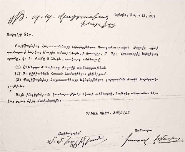 Կալիֆոռնիոյ մէջ առանձին առանջնորդութիւն հաստատելու նկատմամբ կրօնական ժողովիդ տարւոյս Մարտ 3 թիւ 8-292 գրութիւնն, ինչպէս եւ Կալիֆոռնիայի հայոց եկեղեցիների պատգամաւորական ժողովի փետրուարի 11-ի հեռագիրն ստանալով հայրապետական դիւանս մանրամասն զեկոյց Նորին Սրբութեան խնդիրը։