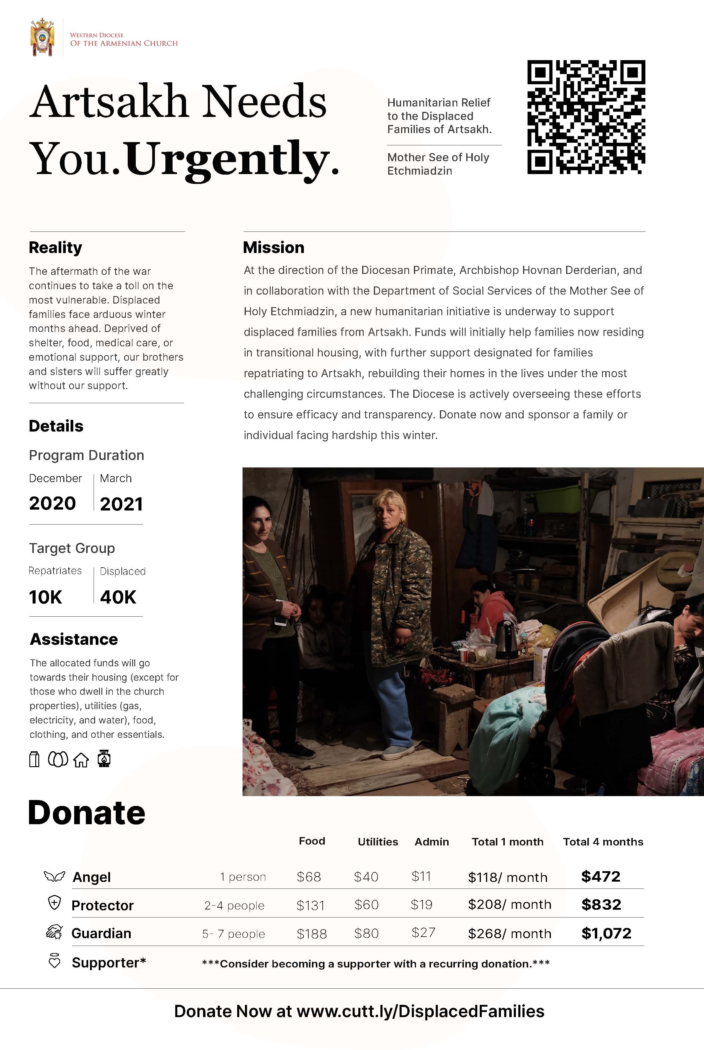 Այժմ փոքր-ինչ մխիթարութեամբ պէտք է յայտնենք, որ տեղահանուածների աջակցութեանը նուիրուած՝ Արևմտեան թեմի ծրագիրը լուրջ արդիւնքներ է գրանցել. Մայր Աթոռի հաշուին արդէն փոխանցուել է առաջին գումարը՝ 50.000 ԱՄՆ տոլար։ Դրա շնորհիւ Մայր Աթոռ Ս․ Էջմիածնի Սոցիալական Ծառայութեան գրասենեակի հետ գործակցութեամբ պիտի ապահովուի Մայր Աթոռի կացարաններում բնակութիւն հաստատած ընտանիքների սնունդը, կոմունալ ծախսերը, իսկ մնացեալ մասը պիտի ուղղուի այլ շրջաններում ապաստանածներին եւ Արցախ վերադարձած կարիքաւոր ընտանիքներին։
