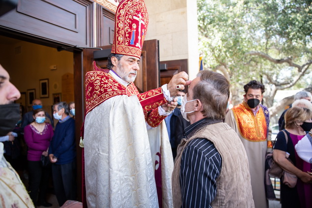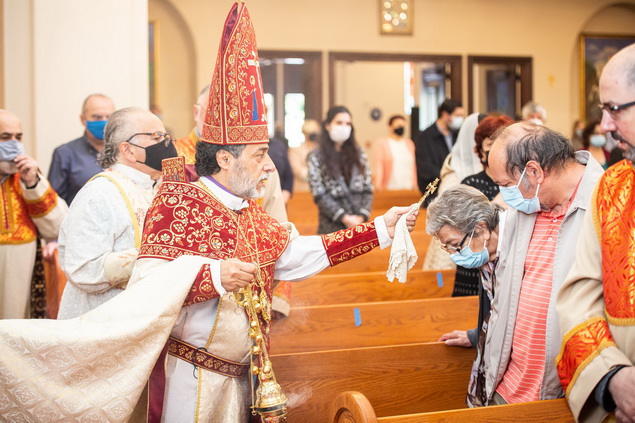 Պատարագիչ Սրբազան Հայրը խնկարկումի շարականի երգեցողութեամբ, եկեղեցւոյ դասը իջաւ ժողովուրդը օրհնելու համար։ Հաւատացեալները Սրբազան Հօր մօտենալով, անոր զգեստները հպելով եւ ձեռքի սրբաշող խաչին առաջ խոնարհելով կը ստանային իրենց օրհնութիւնները, իսկ Սրբազան Հայրն ալ ժողովուրդին կը վստահեցնէր ըսելով. «Յիշեալ լիջիք առաջին անմահ որդւոյն Աստուծոյ»։