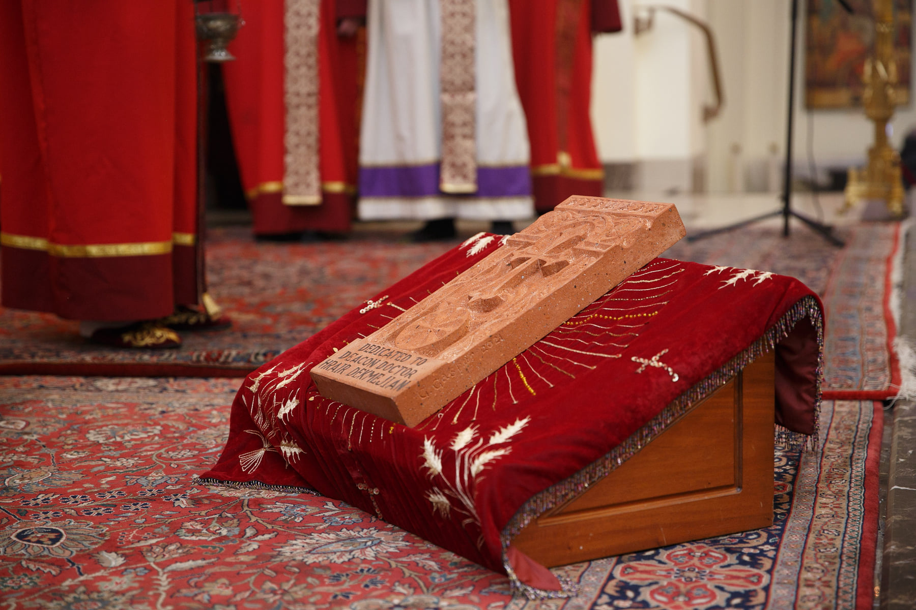 Ձեռնադրութենէն անմիջապէս յետոյ, Գերաշնորհ Տ, Յովնան Ս․ Արք․ Տէրտէրեան Սրբալոյս Միւռոնաւ օծեց եւ սրբագործեց տուֆակերտ սքանչելի խաչքար մը՝ ձօնուած հայ եկեղեցւոյ նուիրեալ երիցագոյն սարկաւագներէն՝ Բարեշնորհ Հրայր Սարկաւագ Տէօքմէջեանին եւ անոր ազնիւ կողակից՝ Տիկին Անուշ Տէօքմէջեանին։ Սրբազան Հայրը իր խօսքին մէջ մեծագոյն դրուատանքով խօսեց Բարեշնորհ Հրայր Սարկաւագի մասին, ներկայացնելով անոր մատուցած շուրջ ութսուն տարիներու նուիրական եւ բացառիկ ծառայութիւնը Հայ Եկեղեցուն, մատնաշելով նաեւ այն հանգամանքը, որ Հրայր Սարկաւագը իր եկեղեցանուէր կերպարով մեր բազմաթիւ եկեղեցականներու համար ներշնչանքի աղբիւր է հանդիսացած, իրենց եկեղեցական ըլլալու ճանապարհին։ Սրբազան Հայր նշեց, որ այս գեղեցիկ խաչքարը իր պատուաւոր տեղը պիտ գտնէ Մայր Տաճարի հարաւային պատին վրայ։