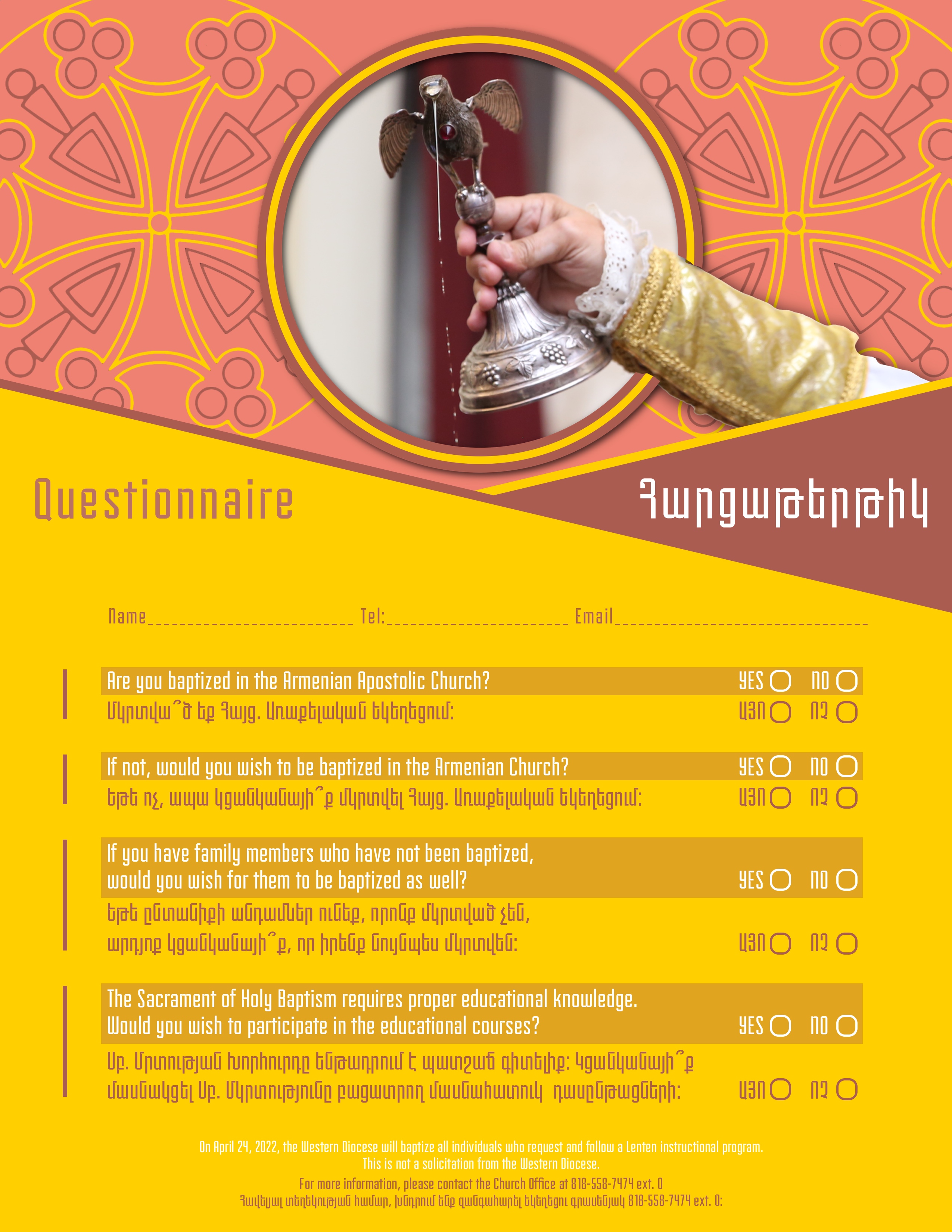 Հայց. Առաքելական Սբ. Եկեղեցւոյ Հիւսիսային Ամերիկայի Արեւմտեան Թեմը պատրաստակամ է որոշապէս լրացնել այդ բացը՝ մկրտել բոլոր այն չափահաս անձանց, ովքեր մինչեւ օրս մկրտուած չեն: