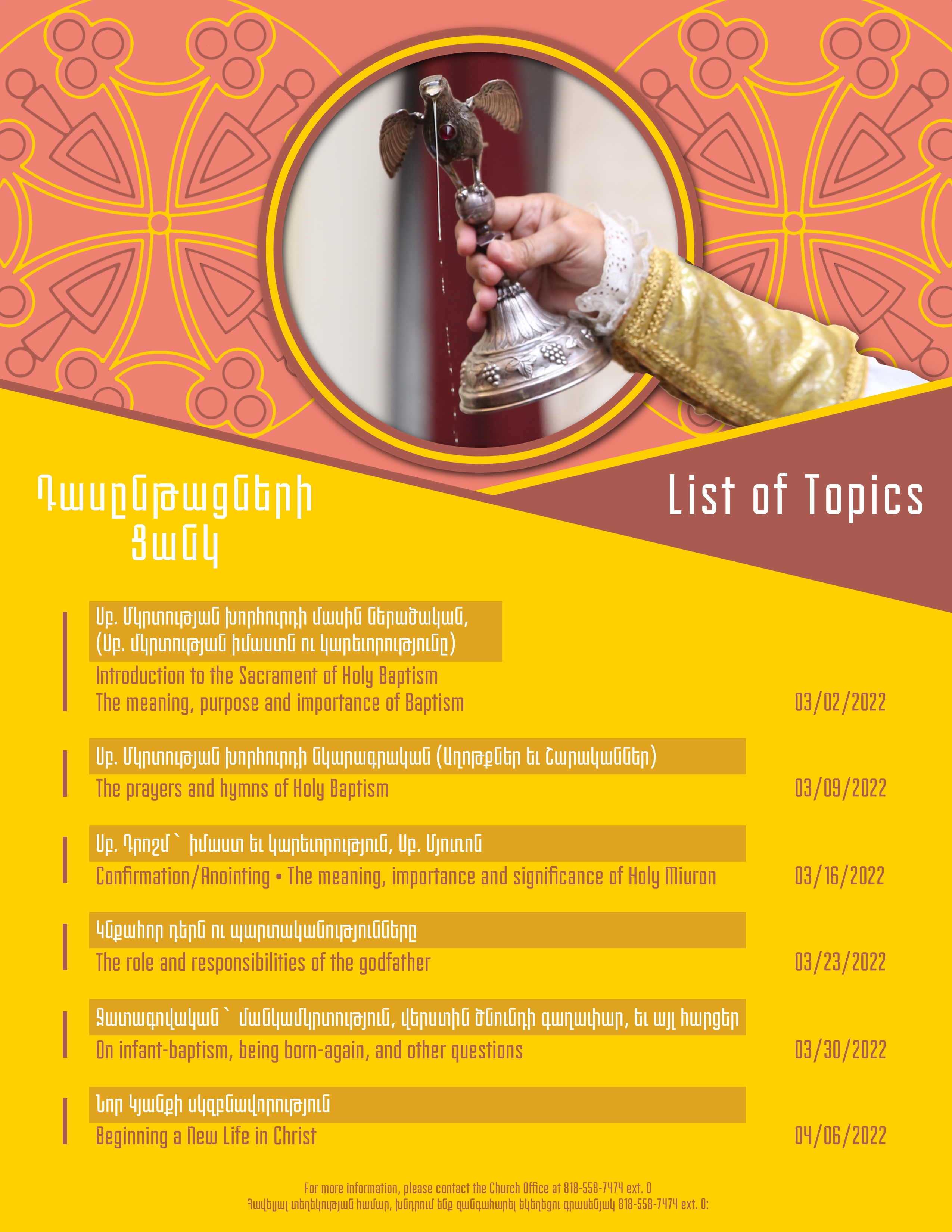 Ծրագրին մասնակցելու եւ յաւելեալ տեղեկութիւններ ստանալու համար կարող էք դիմել Առաջնորդարանի գրասենեակ` զանգահարելով 818-558-7474 հեռախօսահամարով: