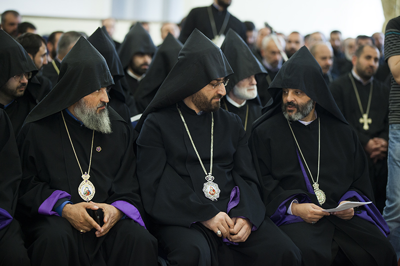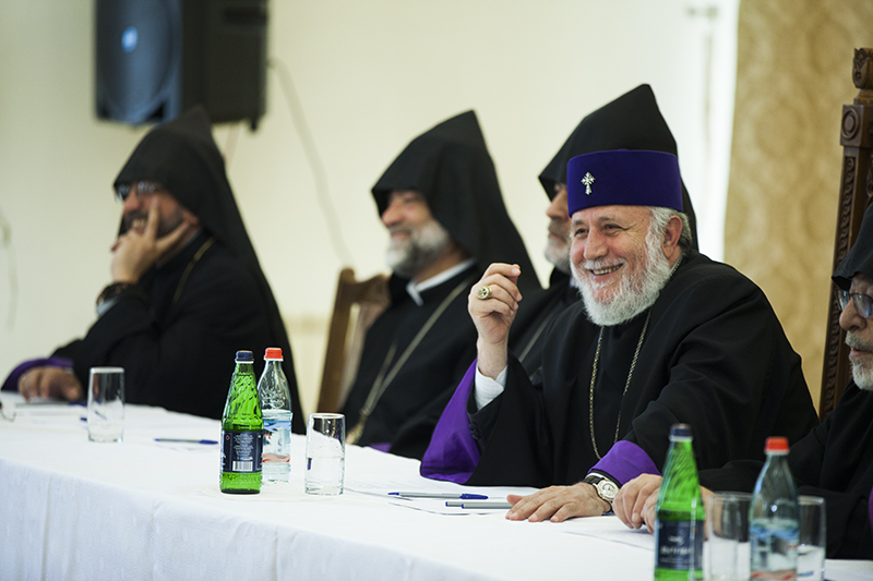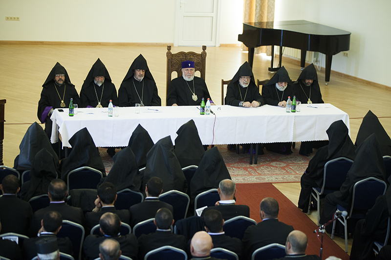 Այնուհետեւ Գեւորգեան հոգեւոր ճեմարանի հանդիսութիւնների դահլիճում ժողովն սկսեց իր աշխատանքը:  Տէրունական աղօթքից յետոյ Ամենայն Հայոց Կաթողիկոսն աղօթեց վերջին տարում ի Տէր յանգչած հոգեւորականների, ինչպէս նաեւ հայրենեաց պաշտպանութեան ընթացքում զոհուած քաջարի հայ զինուորների հոգիների հանգստութեան համար: