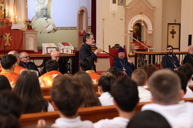 Իր պատգամին մէջ Պատրիարք Հայրը անդրադարձաւ համայնքային կեանքէն ներս կրթական առաքելութեան ու հայեցի դաստիարակութեան կարեւորութեան։ Նորին Ամենապատուութիւնը ուրախութեամբ կարեւորեց այն հանգամանքը, որ հեռաւոր Ամերիկայի Միացեալ Նահանցներէն ներս օրհնութիւն է տեսնել նորահաս սերունդին մօտ մայրենի լեզուին, ազգային-եկեղեցական կեանքին ու մեր աւանդութեանց պահպանութիւնը։ Պատրիարք Հայրը ցաւով անդրադարձաւ Լոս Անճելըսի Յունուարի հրդեհներուն պատճառած վնասներուն եւ գոհունակութեամբ վեր առաւ համահայկական համագործակցութեան ոգին, որուն շօշափելի արտայայտութիւնն է վարժարանի աշակերտութեան փոխադրութիւնը Հ․Բ․Ը․ Միութեան համալիր, մաղթելով ապագային կառուցուած տեսնել Սահակ Մեսրոպ նոր վարժարանը, ուր աշակերտները պիտի շարունակեն իրենց ուսումնական կեանքը։ Այցելութեան ներկայ գտնուեցան Պատրիարք Հօր գաւազանակիր՝ Հոգեշնորհ Տէր Յարութիւն Վրդ. Տամատեան եւ Արեւմտեան Թեմի հոգեւորականաց դասէն Արժ․ Տէր Նժդեհ Քահանայ Քէշիշեան։