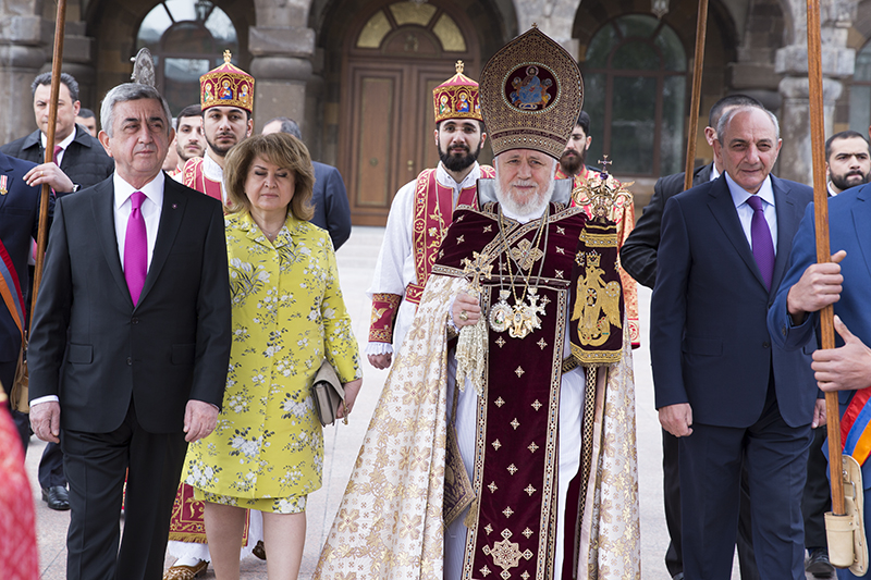 Հոգեւորականների խաչվառազարդ թափօրով, «Հրաշափառ» շարականի երգեցողութեան ներքոյ, Ամենայն Հայոց Կաթողիկոսը, Հայաստանի Հանրապետութեան նախագահ Սերժ Սարգսեանը եւ տիկին Ռիտայ Սարգսեանը, Արցախի Հանրապետութեան նախագահ Բակօ Սահակեանը Վեհարանից ամպհովանիով առաջնորդուեցին դէպի Մայր Տաճար, ուր նրանց դիմաւորեցին Մայր Աթոռի «էօռնեկեան» հանրակրթական դպրոցի աշակերտները, ՀԲԸՄ Երեւանի սկաուտական խմբի անդամները եւ բազում ուխտաւորներ: