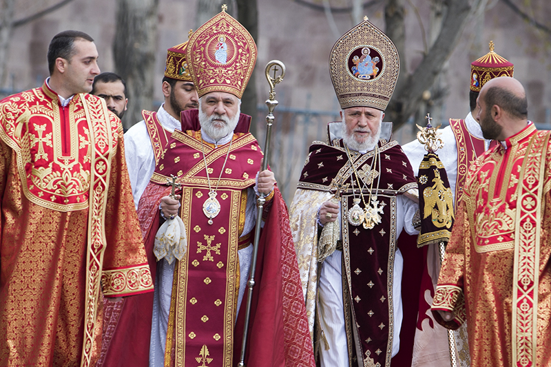 Մեր Տէր Յիսուս Քրիստոսի հրաշափառ Յարութեան բերկրալի աւետիսով մեր ողջոյնն ենք բերում մեր հոգևոր եղբայրներին՝ Ն.Ս.Օ.Տ.Տ. Արամ Ա Մեծի Տանն Կիլիկիոյ Կաթողիկոսին, Երուսաղէմի Հայոց Պատրիարք Ամենապատիւ Տ. Նուրհան արքեպիսկոպոս Մանուկեանին, Կոստանդնուպոլսի Հայոց Պատրիարքական Տեղապահ Գերաշնորհ Տ. Գարեգին արքեպիսկոպոս Բեկչեանին, քոյր Եկեղեցիների հոգևոր Պետերին և մեր Սուրբ Եկեղեցու ողջ հոգևոր դասին: Հայրապետական օրհնութեամբ ողջունում ենք Սրբազան Պատարագի արարողութեանը ներկայ Հայաստանի Հանրապետութեան Նախագահ Տիար Սերժ Սարգսեանին`Առաջին տիկնոջ հետ, Արցախի Հանրապետութեան Նախագահ Տիար Բակօ Սահակեանին, մեր ողջոյնն ենք բերում հայոց պետական աւագանուն, նորընտիր Ազգային Ժողովի պատգամաւորներին և մաղթում, որ Տէրը զօրացեալ պահի առ ազգն ու հայրենին սիրոյ մէջ՝ հայրենաշեն ձեռքբերումներով արդիւնաւորելու բարձր ու պատասխանատու իրենց առաքելութիւնը: Օրհնութեամբ ու բարեմաղթանքներով ողջունում ենք Հայաստանում հաւատարմագրուած դիւանագիտական առաքելութիւնների ղեկավարներին ու ներկայացուցիչներին: Հայրապետական Մեր սէրն ու օրհնութիւնն ենք բերում հաւատաւոր մեր ժողովրդին ի հայրենիս և ի սփիւռս: