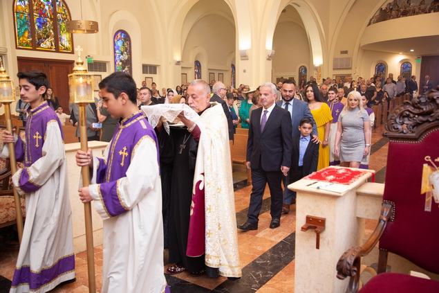 During the service, the Nazerian family were led in processional from the narthex to the nave where the Pontifical Encyclical of His Holiness Karekin II, Supreme Patriarch and Catholicos of All Armenians was read to the congregation from the Holy Altar by Archpriest Fr. Manoug Markarian. His Holiness referenced to Mr. Nazerian’s dedication and selfless service to the Armenian Apostolic Church, the Western Diocese and the Armenian-American community, thus bestowing the prestigious St. Nersess Shnorhali medal upon the honoree.
