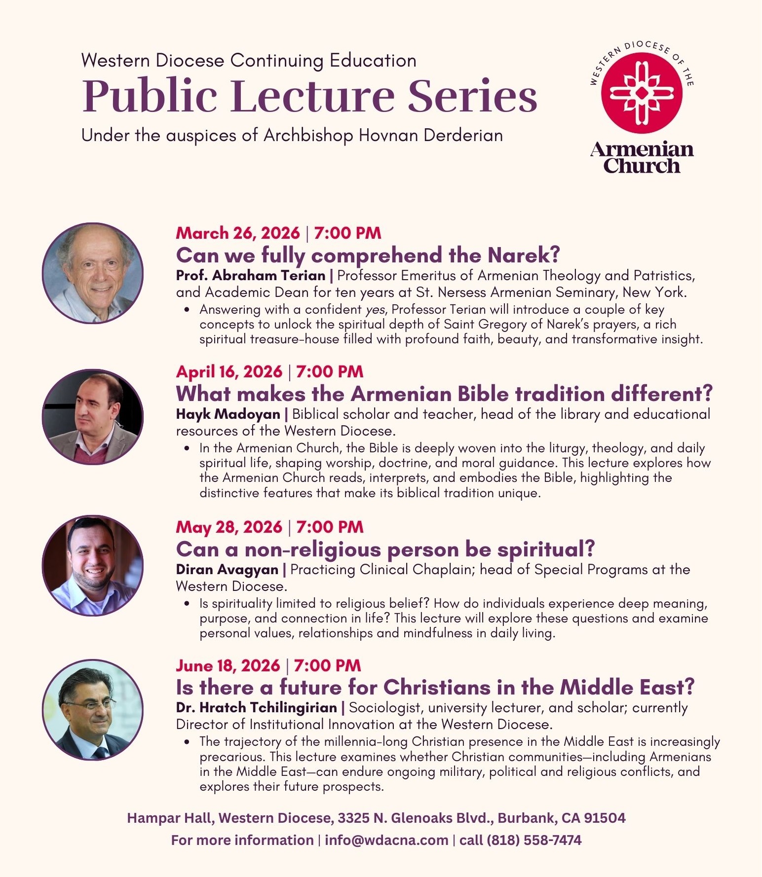 These in-person lectures—held in the Hampar Hall at the Diocese in Burbank—are open to the public and welcome all who are interested in thoughtful exploration of faith, identity, and meaning in the modern world.