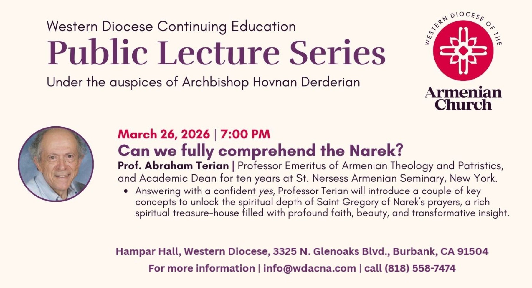 Join us for a special lecture exploring the profound spiritual depth of the prayers of Gregory of Narek, who is venerated as a saint in the Armenian Apostolic and Catholic Churches and was declared a Doctor of the Church by Pope Francis in 2015. Renowned scholar Prof. Abraham Terian will introduce several key concepts that help unlock the richness of Narek’s writings—a spiritual treasure-house filled with deep faith, poetic beauty, and transformative insight. Professor Terian is Professor Emeritus of Armenian Theology and Patristics at St. Nersess Armenian Seminary in New York, where he also served as Academic Dean for a decade, and previously taught Intertestamental and Early Christian Literature for twenty years at Andrews University. He is also an academician of the National Academy of Sciences of Armenia and the Ambrosian Academy of Milan.